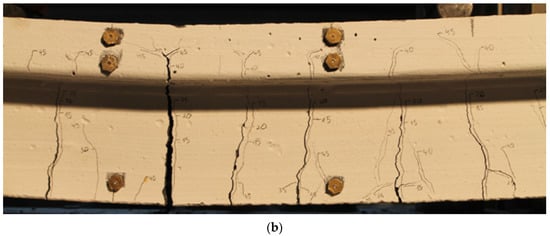 The cracks tests were performed on T-beams with the dimensions shown in Figure 3. The loading was gradually increased in 5 kN increments. In order to facilitate the observation of the appearing of cracks, the beam surface was painted white. The appearing cracks or development of the existing ones were marked on the beam surface.