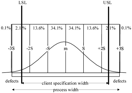 The process capability may be evaluated by putting the lower and upper customer specification limits (marked as LSL and USL in Figure 3) on the normal distribution curve. All the values of the measured process output, which fall between LSL and USL, are considered to be acceptable for the customer. Any values of the process output measure, which fall outside the range of the customer specifications, are considered to be defects. In the context of the process capability, a correct process is the one where half of the graph falls within the range from the mean to the nearer limit of the customer specification. Moreover, the mean of the graph is the same as the mean of the customer specification. Such a process is referred to as a 3-sigma level process, whereas 6 sigma means a situation where a half of the graph can fit twice within the band from the mean to the nearer customer specification limit. Such a graph demonstrates a smaller dispersion, and dispersion is more perceptible to customers. Making a process graph narrower is considered to be much more difficult than shifting its mean. Visual analysis of graphs is very useful and often applied, as it makes it possible to evaluate the process quite quickly in terms of its purposefulness and coherence. Nevertheless, a process graph analysis should be supported by computation of potential process capability (Cp, Equation (1)) and actual process capability index (Cpk, Equation (2)) [39].