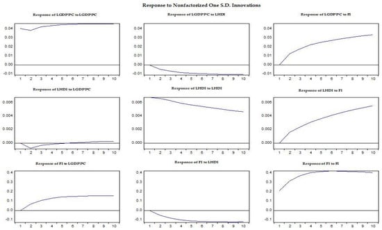 The last step of the panel VECM is to examine the response of the dependent variables to the shocks of the independent variables using the impulse response function (IRF). This represents the response of a given impulse to another variable. Practically, it indicates that, when a time series plot changes by one unit of measurement, another variable changes (up or down) by some amount in the second period. Results of log of GDP per capita, log of HDI, and FI can be seen in Figure 1 for 10 years and to one standard deviation shock. The responses initially generated a very small positive shock of log of GDP per capita to FI and log of human development index to FI with the same distribution for all 10 periods. Thus, the positive shocks of GDP per capita and HDI have a similar positive effect with FI. All models were tested by using residuals. To test for serial correlations, we applied VEC residual portmanteau tests with the null hypothesis that there would be no residual autocorrelations up to lag h. The results showed that all the models are absent of serial correlations (Table S4) up to four lags. In addition, we checked the stability of each model and observed that all the inverse roots are inside the unit circle in all the models (see Figure 2).