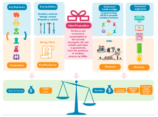 Business model canvas makes isolated microgrids economically sustainable, guarantees technical and economic sustainability, and avoids energy transition in rural electrification [8]. In business model canvas, the market’s basic structure is defined, considering its specific characteristics, such as energy resources, local potential, and demand. In addition, the remuneration of ancillary services in an isolated microgrid does not have a structure; therefore, it is essential to find alternatives for the characteristics that affect the environment in which ancillary services should be provided to the microgrid [50].
