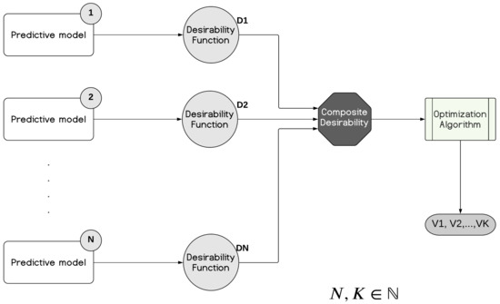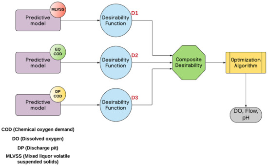 As mentioned before, the main objective is to modify variables intelligently in search of optimal improvement. Therefore, it is necessary to use optimization algorithms that find the best setpoint within an appropriate margin determined by experts in the process. It is appropriate to limit this margin to use functions that transform each variable’s range into a convenient range. For this reason, desirability functions are essential. Using a compound desirability function is vital to condense the desirability functions when more than one variable is part of the system. Finally, the experts’ recommendations and the biological process variables in the wastewater treatment plant lead to contextualizing the conceptual approach in Figure 3.