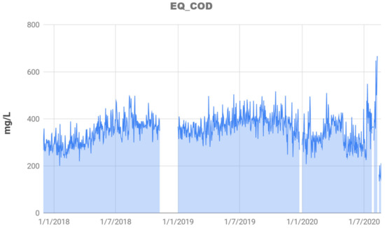 COD is one of the most critical variables in the process of a biological treatment [31] because of the information COD provides, leading to making important decisions. The objective of biological wastewater treatment is to remove the pollutant load in water [32]. In the bioreactor at this stage, a set of microorganisms of different natures break down a percentage of the water’s organic matter. For studying the COD dynamics in the process, a dataset is received from a WWTP from Nantong, China, with a daily data frequency for 877 samples. In this dataset, it registered 22 variables from 1 December 2017 to 16 July 2020. Figure 4 describes the COD dynamics.