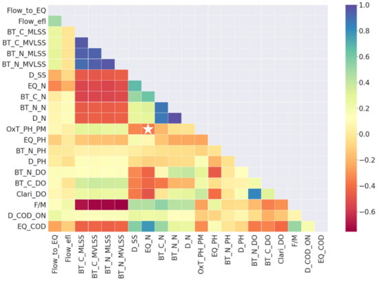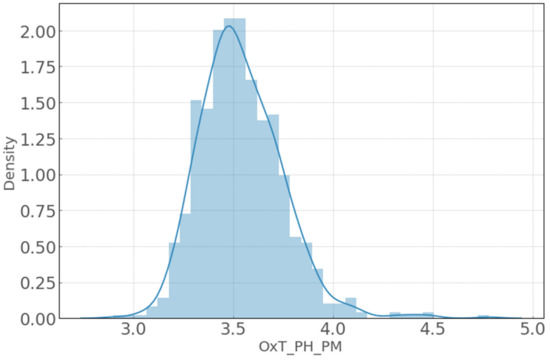 The correlation of each variable with the entire set of variables is analyzed to adapt the predictive model and build an intelligent system to optimize the process at each biological treatment stage. This is in contrast of which variables coincided with the variables, as recommended by the experts. In the correlation matrix presented in Figure 6, the relationship with each variable is detailed. Mainly, the objective is to analyze the variables inputs to the LSTM strongly correlated with the variables to manipulate. Results lead us to conclude that none of the inputs could be modified directly with a controller in this prediction model because the focus is on looking for variables that could be manipulated before the equalizer stage or in the equalizer itself. As a workaround, an indirect relationship could be found between the nitrogen variable in the equalizer (EQ_N) and the pH that could be modified in the oxidation tank, which is before the equalization stage. This variable is labelled as OxT_pH_PM and gives information about the water’s pH in the oxidation tank. Figure 6 points this correlation with the white star. When choosing this variable, it is necessary to study which other variables are affected by the pH change since the pH prescription will change all the variables strongly correlated. Results show no variables have a considerable correlation other than nitrogen. Besides, the pH variable’s operating margins in the process are studied to narrow down the search for the optimization algorithm and find the optimal setpoint. Figure 7 shows the probability density function (PDS) of the pH where the operating margin is between 3.0 and 5.0. Hence, it is the range taken as a study.