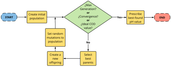 The first criterion sets a maximum of 100 generations to save computing resources. Using the second criterion, the system states that if there is no improvement after a specific number of generations (10% of the maximum number of generations), the algorithm would stop and report the best value found. The last criterion states the algorithm would stop if it finds a COD less than or equal to 250 mg/L (value recommended by the experts). In addition, according to the experts’ suggestions, small pH values are favoured. Figure 9 shows a general scheme about how the genetic optimization algorithm works.