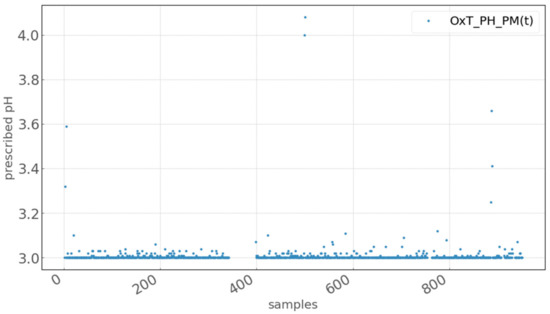 A forecast is made with the LSTM predictive model day by day, taking 877 actual samples from the process to analyze the best pH setpoint that significantly decreased the COD variable. Figure 10 shows the pH points that are selected day by day based on the genetic algorithms (GA) optimization process. Using these setpoints, the predictive model forecasted how the course of the COD variable would change. Figure 11 compares the forecast with the actual values and the changes with the prescribed values for pH.