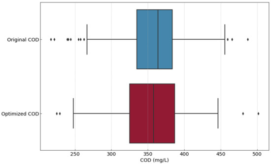 An important observation to highlight is that the original signal corresponding to COD is 0.86% higher than the optimized one. This result meets the objectives considering that the COD predictive model depends on 18 variables, and the prescriptive system only selects the EQ_N for the respective optimization by modifying pH. As mentioned before, Table 2 shows these 18 variables. From these variables, EQ_N is the variable controlled by OxT_pH_PM to optimize COD for the reasons stated before in the correlation analysis. Besides, box-and-whisker plots analysis supports the claim found using Equation (1). For further explanation, Figure 12 shows two boxes that account for each time series measurements’ distribution.