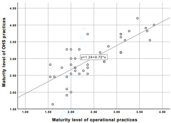 Scatterplot with regression line of maturity levels of OHS and operational practices.