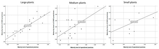Figure 3 shows scatterplots with linear regression lines for the three types of plants. Data from large companies present a better fit around the regression line than medium and small plants. These results suggest that plant size affected the strength of the correlation between the maturity levels of OHS and operational practices. Specifically, large companies were more likely to have had an OHS system with a high (low) maturity level if their operational practices had a high (low) maturity level and vice versa.