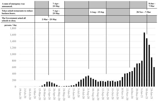 Weekly average of the number of positive cases a day and related social conditions in Tokyo. Note: Data were downloaded via the NHK website (https://www3.nhk.or.jp/news/special/coronavirus/) (accessed on 8 February 2021).