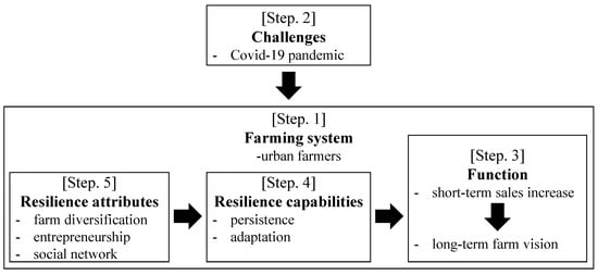Figure 2 illustrates the conceptual framework of this study. First, the targeted farming system includes individual urban farmers in Tokyo. Generally, these farmers are highly independent of each other. Thus, it is difficult to consider UPA as an integrated farming system. Second, the challenge faced by urban farmers is the Covid-19 pandemic. This pandemic is a shock to the socio-economic activities and public health of human beings. Third, the short-term objective of urban farmers is to maintain the status quo or increase their sales during the pandemic. Moreover, this short-term goal may contribute to a more long-term farm vision for development. Fourth, the types of resilience capabilities, persistence, or adaptation should be clarified. The difference between the two capabilities is whether significant changes are followed by resilience. In short, adaptation means that urban farmers proactively change their crops, farming methods, marketing channels, and business models. Lastly, this study defines the resilience attributes that significantly affect resilience capabilities such as direct marketing practices, entrepreneurship, and social network of farmers.