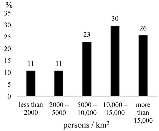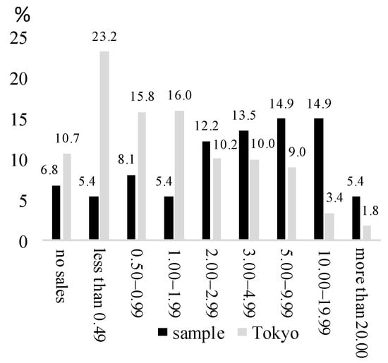 Regarding farm sales in 2019, as shown in Figure 5, 20.3% of sample farms’ sales and 5.2% of them in Tokyo are more than 10 million yen. This means that the sample is highly biased to large-sales farms because of the snowball sampling. Figure 6 shows the population density at which each farm is located. Most of the sample farms are located in areas with a population density of more than 5000 persons/km2. As the population density of Tokyo is 6168 persons/km2, the sample farms are located in relatively high-density areas in Tokyo. According to these results, the business size of sample farms and farm locations seem to be evenly distributed, and the sampling bias should be small.