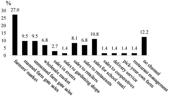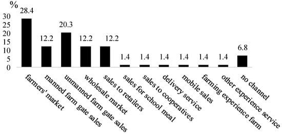 Figure 7 and Figure 8 show the rate of farms by the first largest marketing channel (1st channel) and the second largest marketing channel (2nd channel), respectively. Figure 7 illustrates that as the 1st channel, 28.4% of the samples choose farmers’ markets, and 32.5% choose farm gate sales (manned or unmanned). This means that direct marketing is the most popular diversification strategy for sample farms. Conversely, 24.4% sell their products to mass marketing channels (wholesale market and sales to retailers). As seen in Figure 8, although direct marketing channels are still popular, other diverse channels such as sales to school meals or sales to restaurants are common as the 2nd channel.