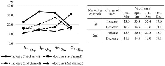 In this section, we describe the transitions in farm sales and the factors influencing sales changes in 2020. Figure 9 shows the percentages of farms by year-over-year sales change (increase, no change, or decrease) of the 1st and 2nd channels in every quarter. The results of “no change” are omitted in the figure. Most importantly, the percentages of sample farms who answered that they increased their sales in both the 1st and the 2nd channels compared to sales in 2019 were higher than the percentage of those who decreased their sales from January to September. This suggests that in 2020, a large number of sample farms experienced farm sales increase during the Covid-19 pandemic. Conversely, the rate of sales-increasing farms dropped sharply from October to December 2020. In brief, whereas the trend of the sales increase was evident for urban farmers until September, this trend did not continue until the end of 2020.
