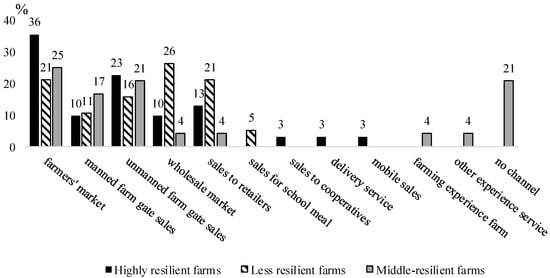 Direct marketing is one of the resilience attributes hypothesized to affect sales changes. This study examines the largest marketing channels of each farm. Marketing channels such as farmers’ markets and farm gate sales (manned or unmanned) are classified as direct marketing channels. In addition, other channels such as sales to the wholesale market and sales to the retailer are referred to as mass marketing in this study.