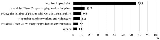 In addition, the Tokyo Metropolitan Government had asked restaurants, bars, and nightclubs to reduce their business hours four times, which spanned approximately seven months in total. As marketing channels to such food-service industries are also important for urban farmers, this economic situation would have had a negative impact on farm performance. Moreover, diverse events and services, such as farming experience services, direct marketing events, and agritourism, were restricted or voluntarily closed during this period.