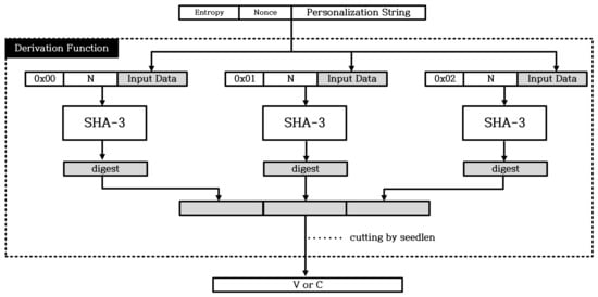 Figure 4 shows the overall overview of Hash_DRBG, and Table 3 shows the specification of parameters used in Hash_DRBG. Hash_DRBG basically extracts a random bit while updating operational status consisting of V and C. The length of V and C is the seedlen for each hash function. The initial setting of operational status is completed by using the derivation function in the instantiate function. Afterward, random bit is extracted using operational status in the generate function. After extracting random bit, the value of V is updated through the hash function. Figure 5 shows the structure of the derivation function. The derivation function is a function to extract V and C for the initial instance setting. It updates V and C by operating the hash function as much as len_seed for input data. For instance, in the case of Hash_DRBG using SHA3-512, len_seed is 3, so the hash function is operated three times for input data. The reseed function is a function to update operational status when the generate function is called multiple times and has the same structure as the derived function. The extraction function is the process of extracting the actual random bits. It receives V as an input and extracts as many random bits as the user wants using the hash function. At this time, when the hash function is used multiple times, the value of V increases by 1. Finally, when random bit extraction is finished, operational status is updated.