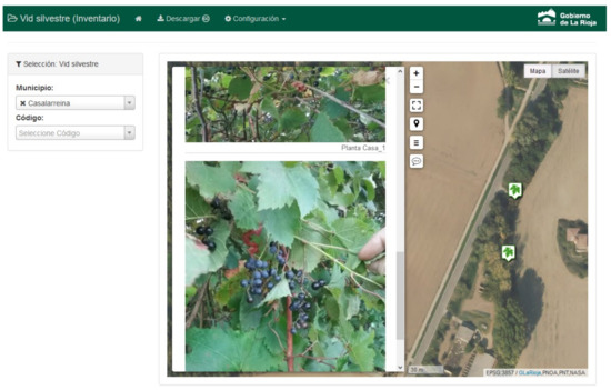 Thematic viewer of the regional government of La Rioja (Spain) showing the layer with the location of the specimens of wild grapevine—Vitis vinifera L. subesp. sylvestris (Gmelin) Hegi—and some of the associated documents (in this case, two photographs) (This thematic map can be seen and used in the viewer of the regional administration: https://www.iderioja.larioja.org/vct/index.php?c=4e38512b51695553786e4143325369447a74484270513d3d and accessed as a geoservice according to the Open Geospatial Consortium (OGC) standards: Web Map Service (WMS) in https://ogc.larioja.org/wms/vidsil/request.php and Web Feature Service (WFS) in https://ogc.larioja.org/wfs/vidsil/request.php) (all web services accessed: 15 February 2021).