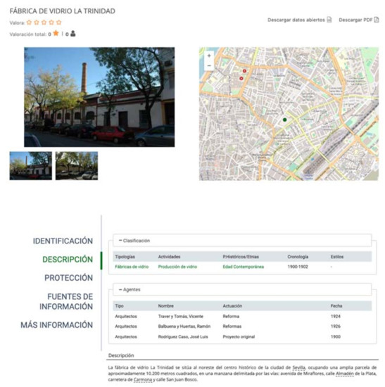 Record for the glass factory “Fábrica de la Trinidad”. Apart from the identification of the element, a textual description, some images, the location on a map and links are provided. The records can be downloaded in PDF form for human readers and JSON (JavaScript Object Notation) for machine processing (https://guiadigital.iaph.es/bien/inmueble/8145/sevilla/sevilla/fabrica-de-vidrio-la-trinidad, accessed: 15 February 2021).