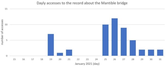 Another important issue is the evaluation of the use, both quantitatively (how many users visualize and download the datasets) and qualitatively (what kind of uses arise). For instance, the next chart (Figure 6) shows the number of accesses during the second half of January 2021 to the record about the ruined bridge of Mantible, which is stored in the university repository (the one in Figure 3). A look at the statistics of use of the previous six months shows an average number of 6–7 accesses per month. The number of users that reach the repository are very far from the order of magnitude of the information distributed through social networking sites; however, that fact does not mean that the contents are unattractive for the general public (good photographs, for instance, are always well received, as well as the 3D models, videos, etc.), nor does it necessarily imply low-impact uses. In fact, the chart shows two peaks of use that are related to, on the one hand, the use of this record in an academic activity and, on the other hand, the interest aroused by the loss of a significant part of this element of heritage due to its partial collapse. Both situations prove the close cause-effect relationship between the events and the use of the information.