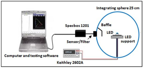 The opto-electrical setup illustrated in Figure 1 was used to measure each LED spectrum within 380 and 780 together with its electrical characteristics.
