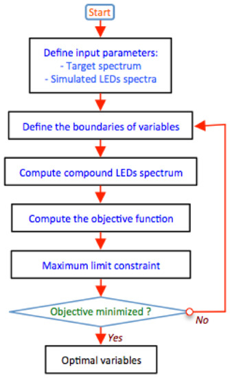 In this mono-objective PSO, each LED-type is considered a swarm-particle. The number of a particular colored LED represents its position (at iteration k). A set of random numbers gives the progression speeds of all the particles, which allows for the calculation of the new position (iteration ). Optimization is achieved by considering the whole spectral domain at a time by using Equation (12). The different steps of the optimization procedure are depicted by the flowchart given in Figure 2.
