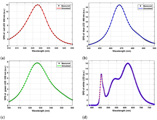 The recorded spectrum of the LED is depicted in Figure 3b, while its peak wavelength, FWHM as well as forward voltage are given in Table 3. The SPD is non-symmetric (crosses: measured spectrum, full line: Gaussian sum fit). The fit is very good as confirmed by Table 4 ( for ), where all the fitting parameters are given for all the colored LEDs. Their SPDs are given in Figure 3 and Figure 4. ’s SPD (3 exponential terms), which is very similar to that of (3 exponential terms, as well), which is not given. These results comfort our idea of retaining the multi-Gaussian model. Three or four exponential terms are required for our colored LEDs. Figure 3d represents the measured and simulated values of the W white LED’s SPD, which cannot be modeled with a Gaussian sum.