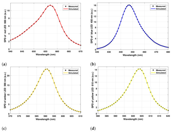 Measured and simulated LED SPDs at 20 mA: (a) R2 LED; (b) B2 LED; (c) A LED; (d) Y LED.