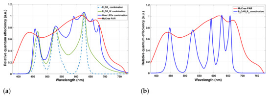 Photosynthesis processes involve various pigments such as chlorophyll a, chlorophyll b, and carotenoid [37]. Plants mainly require certain specific radiations [38,39,40,41], mostly concentrated in the red and blue regions [42,43,44,45,46]. Therefore, artificial light should be adjusted to match individual plant target spectrums. Broadband artificial light sources are less efficient due to unused radiation. On the contrary, LEDs are suitable artificial sources due to their single narrow emissions (spectral widths in the range 15–30 nm). About 20 different LEDs are required to cover the solar visible range. However, following specific photosynthesis processes, any plant may require at most 10 different LED types.