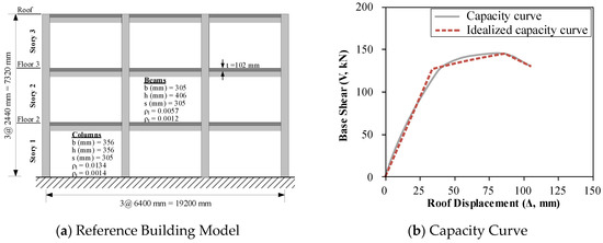 The building model is vulnerable to shear failure due to its seismically deficient detailing, such as a low transverse reinforcing bar ratio, and 90-degree L-shaped corner hooks that led to poor concrete confinement. In the analytical model, the concrete compressive strength (fc′) of 25.9 MPa and rebar yield strength (fy) of 303.4 MPa with 0.5% strain hardening ratio were used in this model. The masses of the frame were lumped at beam-column joint nodes in each story level. The lumped masses were computed with the load combination DL + 0.25LL, where DL = dead load and LL = live load. The self-weight (DL) was calculated based on the cross-section of each element and element length with the assumed density of concrete material (≈2400 kg/m3). The effective mass (Meff) of the building model was approximately 193.60 N-s2/mm. More detailed information on the building model can be found in [32].