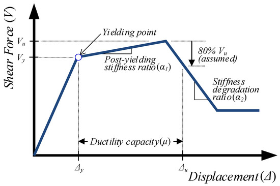 To derive the structural properties of the building model, this study performed eigenvalue and nonlinear pushover analyses. For the eigenvalue analysis, the model’s periods (T1, and T2) for the first and second modes are 0.46 and 0.11 s, respectively, and the mass participation ratio is 90.2% for the first mode and 8.30% for the second mode. Therefore, it was found that the building model was governed by the first mode. The normalized mode vector of the reference model in the first mode is 0.73, 0.88, and 1.0 for first-, second- and third-story, respectively. Figure 3b shows a nonlinear pushover curve of the reference model with an idealized curve. The idealized force–displacement curve was derived as specified in Federal Emergency Agency (FEMA) 356 [33]. The idealized curve was utilized to compute the structural parameters at yielding and ultimate conditions. The structural parameters include yielding strength (Vy), yielding, and ultimate displacement (Δy and Δu). The Δu was calculated at the point where the ultimate strength (Vu) was reduced by 20%. To implement the building model into the nonlinear SDOF model, the structural parameters obtained from the pushover analysis were transformed to a yielding spectral acceleration (Say) using Equation (3a), and displacement ductility capacity (μ) using Equation (3b), (for flexure-shear failure mode, Say = 0.62 g and μ = 2.33). Based on the structural parameters, the structural input parameters representing the nonlinear behavior were determined in Section 3.2.