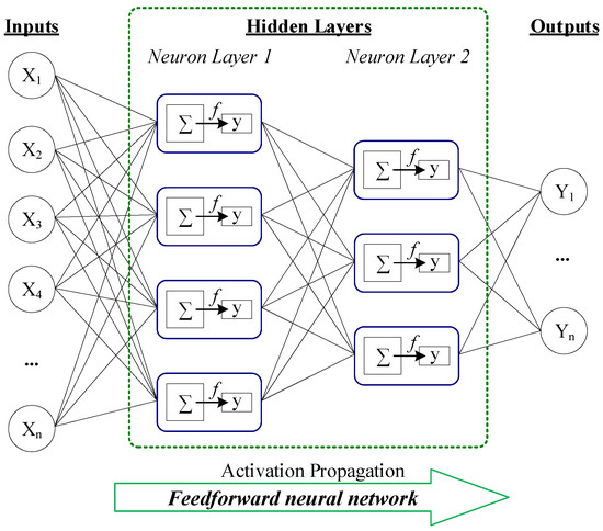 In the past decades, the growing use of ANN in engineering increased the applicability of this brain-inspired technique to solve many engineering problems with the nonlinear relationship between input and output [39]. The ANN structure is composed of the input layer, zero or more hidden layers, and output layer, which are interconnected by multiple nodes in each layer as illustrated in Figure 5. The value of neurons at the immediately following layer of the input layer (xj) is expressed as: