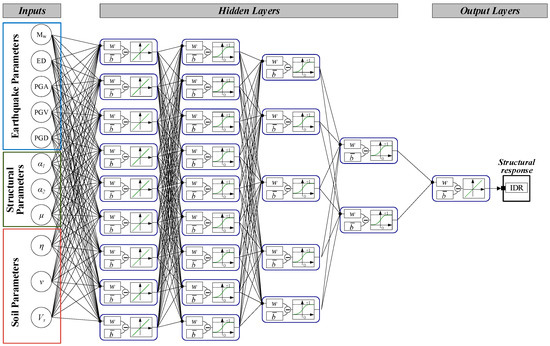 Figure 6 illustrates the ANN structure developed in this study to produce the peak IDR with the SSI effects. The model was constructed with the 11 input and 1 output parameter as described in Section 3. The neural network model used in this study was composed of multiple hidden layers: two nine-hidden layers and one four-hidden layer, and one two-hidden layer. The number of the hidden layers was determined using the trial-and-error method until the ANN model ensured more than 80% accuracy. As illustrated in Figure 6, a linear transfer function was assigned to the first hidden layer and the output layer, and a log-sigmoid transfer function was utilized to the remaining hidden layers. To solve the nonlinear problem, this study utilized the Levenberg–Marquardt Algorithm (LMA) in the neural network model as the learning algorithm, which provides the best-fit values of the w and parameters in the activation functions to minimize the mean squared error (MSE) in an iterative process.
