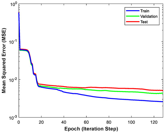 where n = the number of samples; Yi = ith predicted value; and Ti = ith target value. As shown in Figure 7, the training of the ANN model was stopped at the 129th iteration step where the MSE was minimized, where the values of the MSE for the training, validation and testing sets are estimated as 0.003, 0.004, and 0.005, respectively. The difference between the MSE-values between the training and testing sets was negligible.