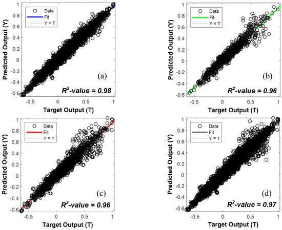In addition, the performance of the ANN model was evaluated by a simple regression model, Y = T regression model. The regression model can judge the correlation between the Y- and T-values. Figure 8 shows the relationship between the Y and T values for the training, validation, testing datasets, and the entire dataset with the coefficient of determination (R2) values. The R2 can be evaluated as: