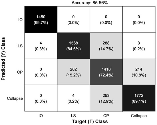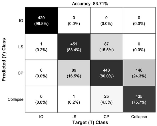 The confusion matrix was evaluated in this study to estimate the classification of the seismic performance levels from the developed ANN model. The evaluated target and predicted peak IDR values were utilized to build a confusion chart, which enables the developed ANN model’s accuracy for classifying the seismic performance levels by Drift-based Performance Limit States in Table 2. Thus, the off-diagonal elements in Figure 9 and Figure 10 represent the failure of predicting the seismic performance level by the developed ANN model. The accuracy of the ANN model for the classification problem defines the ratio of the number of successful predictions over the total number of samples.
