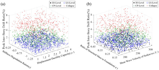 This section presents the potential use of the developed ANN model (with >80% accuracy) as a rapid decision-making tool for determining the seismic performance levels. The peak IDR responses were generated by the developed ANN model without the analytical modeling of the building structures and multistep analysis procedure described in Section 2.2. Figure 11 presents the 4000 data points among 50,000 evaluated peak IDR values with respect to 50,000 sets of randomly generated input parameters. Figure 11 provides the fraction of performance levels at a given range of structure-related and geotechnical input parameters used in this study. Notably, to produce the 50,000 reliable responses using the ANN model, about 3 min were taken using a computer with 3.00 GHz CPU and 8 GB RAM. This indicates that the proposed framework in this study for developing the ANN model substantially reduced the computational time compared to the traditional FE models.