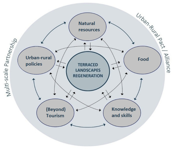 Circularization principles and models are gaining increasing attention [38,73,74,75,76], and potentially apply to different sectors related to rural regeneration [46]. Cultural and natural heritage of terraced landscapes can be a powerful economic, social and environmental catalyst for regeneration, sustainable development, economic growth and improvement of people’s wellbeing and living environments, if circular processes are activated, enhancing rural landscapes productivity in a multidimensional perspective, creating “shared value” for all territorial actors [33].