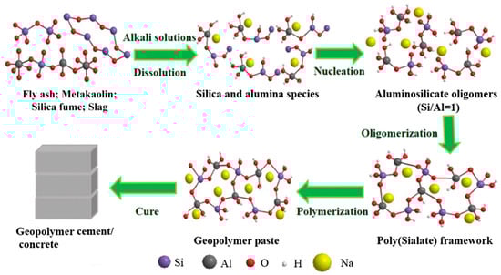 Geopolymerisation process for the fabrication of geopolymer cement/concrete. Different sources of siliceous and aluminous materials are used for the production of geopolymers, the most common including fly ash, metakaolin, silica fume, ground granulate blast slag, and other ashes such as volcanic and biomass ashes. Reprinted with permission from ref. [20]. Copyright 2016 Elsevier.
