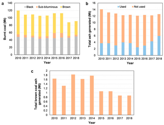 Quantity of burnt coal by type (a), total ash generated (b), and total brown coal fly ash generated (c) in Australia by year from 2010 to 2018. Data adapted from ref. [16].