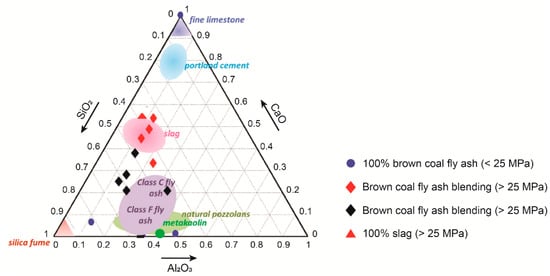 Chemical composition diagram with red markers indicating suggested brown coal geopolymer bulk mix chemistry. Reprinted with permission from ref. [25]. Copyright 2015 Elsevier.