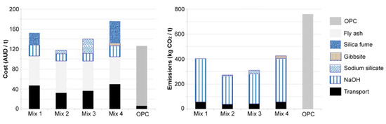 The current body of research on the economic factors affecting geopolymer in Australia has largely taken similar approaches, which comprise the estimation of the material, transport, mixing, and placing costs via a compilation of inventory data. McLennan et al. [6] considered four mix designs taken from past studies that yielded strength similar to the OPC concrete tested and estimated their total mix design costing, with comparisons made to the cost of OPC concrete. Figure 4 shows the estimated cost and associated GHG emissions of the potential geopolymer mixes. The results indicated that geopolymer has costs ranging from 7% cheaper to 39% more expensive than OPC concrete in Australia with the critical cost factors found to be black coal fly ash, sodium silicate, and transport costs.