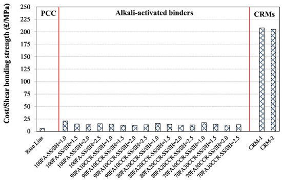 Cost analysis of alkali-activated high-calcium fly ash/recycled calcium carbide mortars as commercial repair materials. PCC—Portland cement concrete; CRM—Conventional repair materials; FA—Fly ash; CCR—Calcium carbide residue; SS—Sodium silicate; SH—Sodium hydroxide. Reprinted with permission from ref. [39]. Copyright 2020 Elsevier.