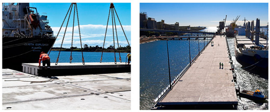 Use of geopolymer precast panels, named as “Earth Friendly Concrete”, in the construction of a wharf on the Brisbane River at Pinkenba, Queensland. Reprinted with permission from Wagners [45]. Copyright 2021 Wagners.