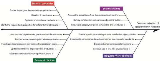 The current standardisation research and regulatory environment in Australia represent many barriers to commercialisation. Due to a lack of clear and regulatory approved standards guiding mixing and placing techniques, chemical and material property stipulations, and durability testing methods, new entrants to the geopolymer supply market need to conduct independent literature reviews and testing, which are both very time-consuming processes. Companies currently supplying geopolymer are also hamstrung by the key standard organisation in Australia, Standards Australia, which is not yet recognising geopolymer as a construction material in its own right, and thus, current avenues for sale are largely centred around VicRoads projects and isolated private pours [15,55].