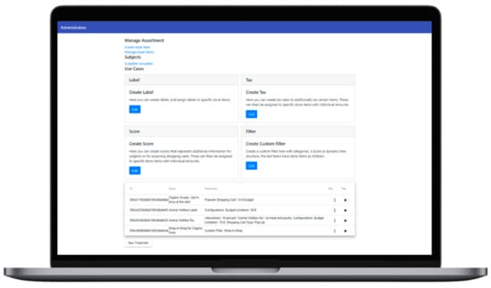 The VAI is a visual subdomain where each authenticated user (administrator) has their own workspace (Figure 2). It provides the means for managing the product database and various modification options that allow researchers to determine which information or functions the shop view presents. In the following, we refer to these predefined modification options as “Use Cases” because researchers can use and modify them to create their own experimental treatments. For instance, without any mandatory knowledge in programming, it is possible to create or edit the items, filter mechanisms, taxes, labels, scores, configure VCS’s functions, and implement swap interventions. Swap options offer consumers the opportunity to replace a selected food item, for instance, with a healthier or more sustainable one [25]. Furthermore, researchers can limit participants’ shopping budget for each treatment. This might be particularly relevant for spending tracking experiments [29]. In this manner, it can be safeguarded that subjects invest reasonable effort into the shopping task and do not merely click through it. Here, just one click is necessary for immediately testing all created treatments in a demo mode.