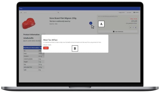To this end, a VOS offers researchers an easy way to create their own or implement existing taxation models (e.g., meat tax) and evaluate their effect on consumers in a realistic online shopping environment. When defining an experimental treatment, researchers can configure whether and for which products taxes should be displayed and charged in the shop. Additionally, further information on the tax can be provided. Consumers will find this information on the product page of each item affected by the tax (Figure 3). Here, the VOS automatically tracks whether a consumer has retrieved this information or not.