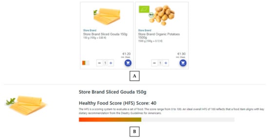 Shop view—(A) exemplary score display (left) and food labeling scheme (right) in the food-card component and (B) score display in the food-details component.