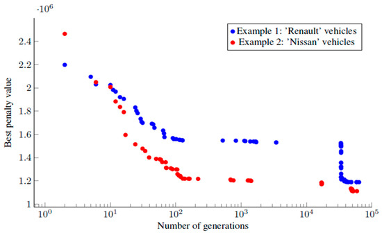 Table 5) is obtained, in a reasonable amount of time (based on a computer equipped with a dual-core 2.9 GHz Intel Core i5 processor with 16 GB 2133 MHz of memory) of about 15 min after the 63,458th and the 58,964th generations for examples 1 and 2, respectively. After numerous tests, it was not necessary to increase the number of generations in relation to the obtained solutions and the elapsed time.