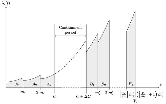 The first term of the sum expresses the number of failures for the complete intervals between two PM of periodicity . The second term stands for the average number of failures for the last (incomplete) interval until the start of the containment period. The third term corresponds to number of failures for all complete intervals between two PM of periodicity , i.e., after the confinement period. Finally, the fourth term expresses the average number of failures until the end of the use of the vehicles (incomplete interval).