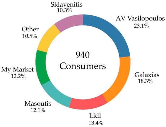 Figure 1 shows the distribution of the 940 survey participants according to the supermarket store they usually choose for their purchases. More precisely, 217 of the participants have selected as their main market AV Vasilopoulos representing 23.1% of the total sample. Galaxias was the second most preferable store with 172 consumers selecting it for their everyday purchases. Lidl, Masoutis, and My Market have scored 126, 114, and 115 participants, respectively. The lowest market shares refer to “other” and Sklavenitis markets.